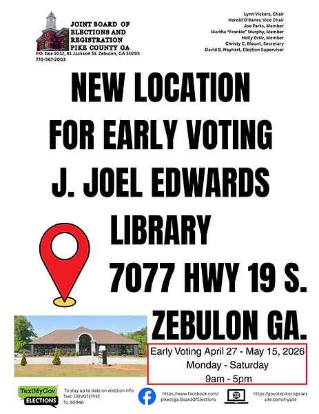 Pursuant to O.C.G.A. €21-2-386(a)(4) and State Election Board Rule 183-1-14-0.9-.15 Notice is hereby given that the early processing of absentee ballots for the General Primary and the City of Williamson Special Election on May 19, 2026, will begin at 10am or 3pm beginning May 19, 2026, and continue until all ballots are processed. This process will be performed at The Joint Board of Elections and Registration of Pike County office, located 81 Jackson St., Zebulon GA 30295.